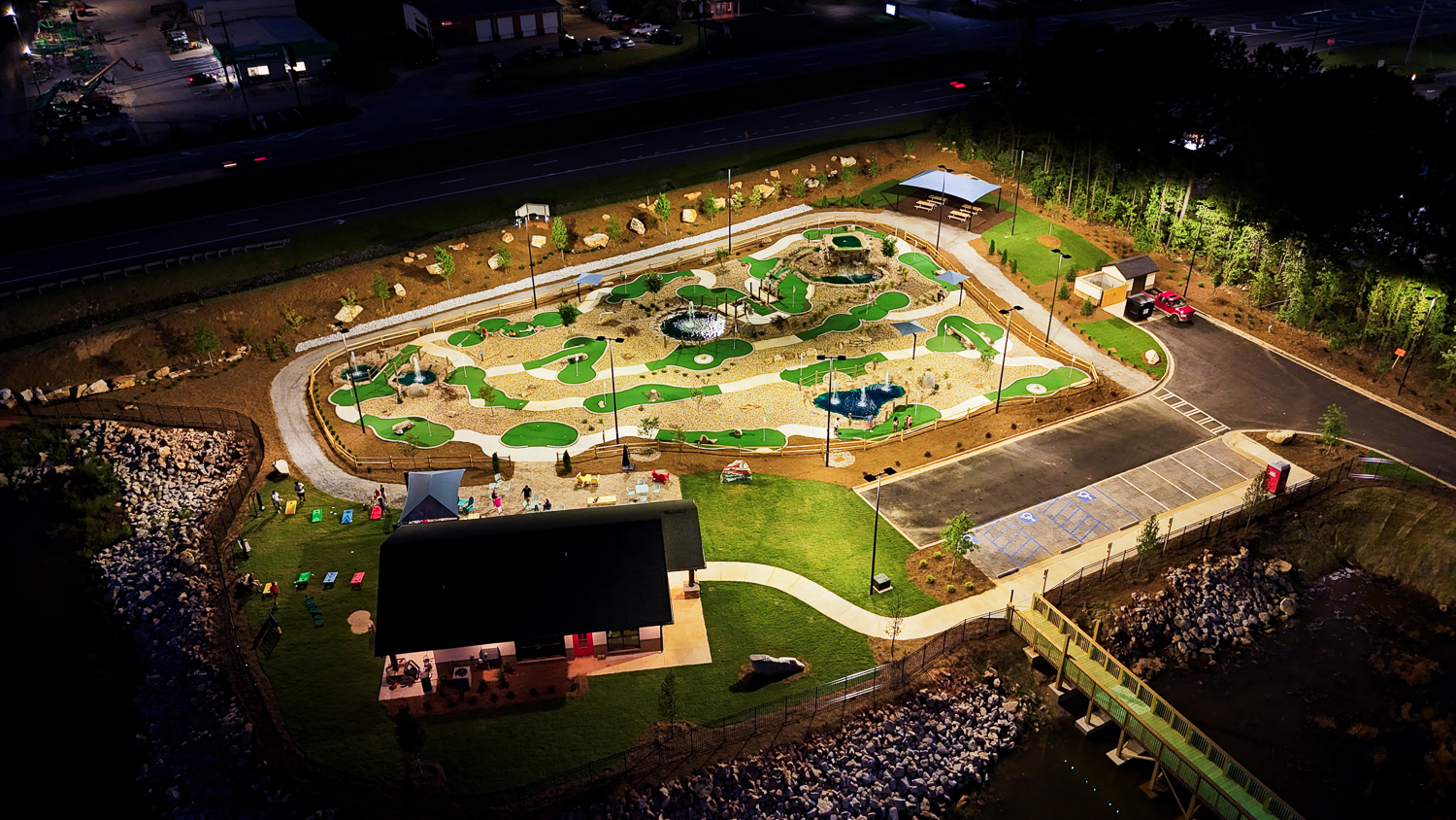Located in Sharpsburg, Georgia, Putter’s Pointe Outdoor Miniature Golf features meticulously designed holes inspired by exotic landscapes, complete with cascading waterfalls and lush tropical plants. Each putting green boasts premium materials for a smooth game, while attentive staff cater to your every need with snacks and refreshing beverages. Elegant seating areas and chic lighting create an inviting atmosphere, perfect for relaxing between rounds.